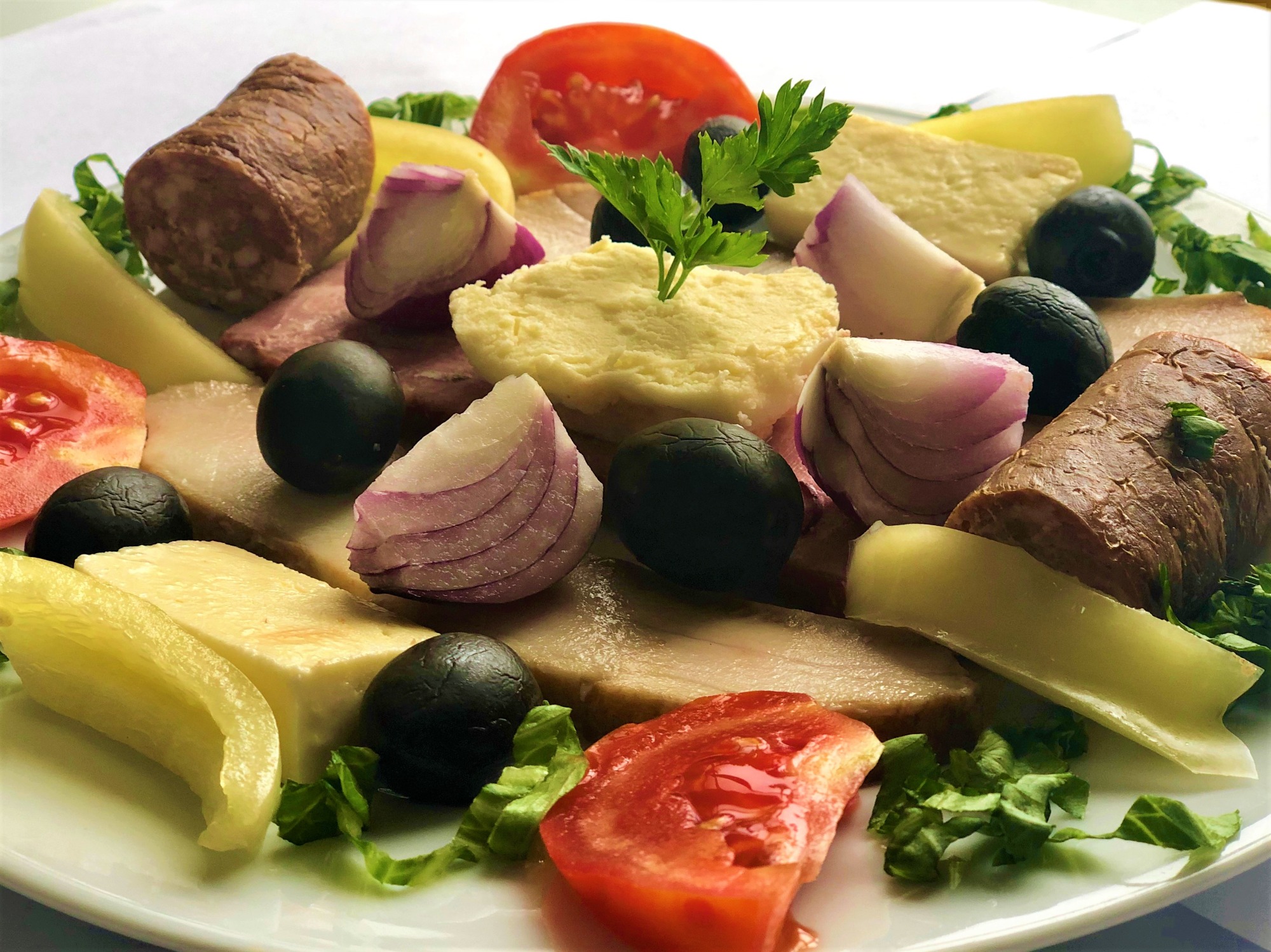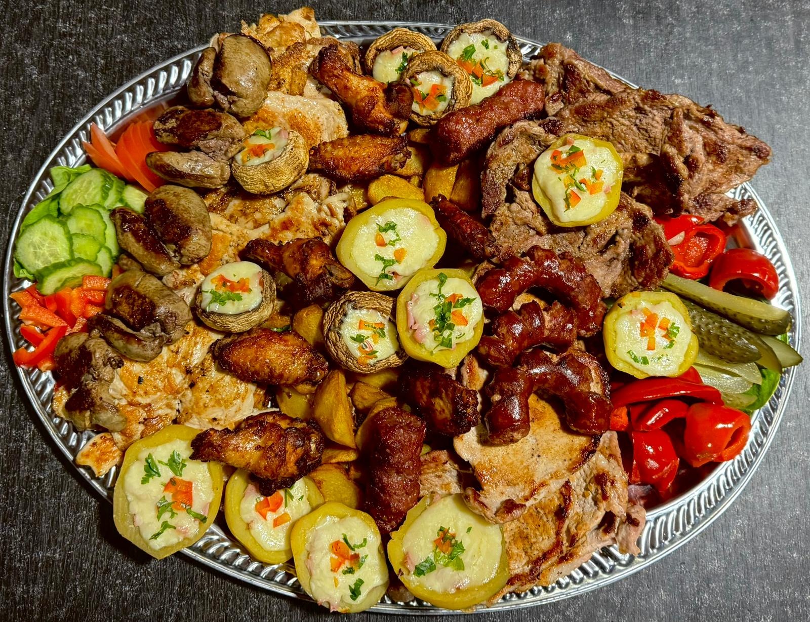 sos pizza, mozzarella, salam, cârnați de casă, telemea, ciuperci, măsline -