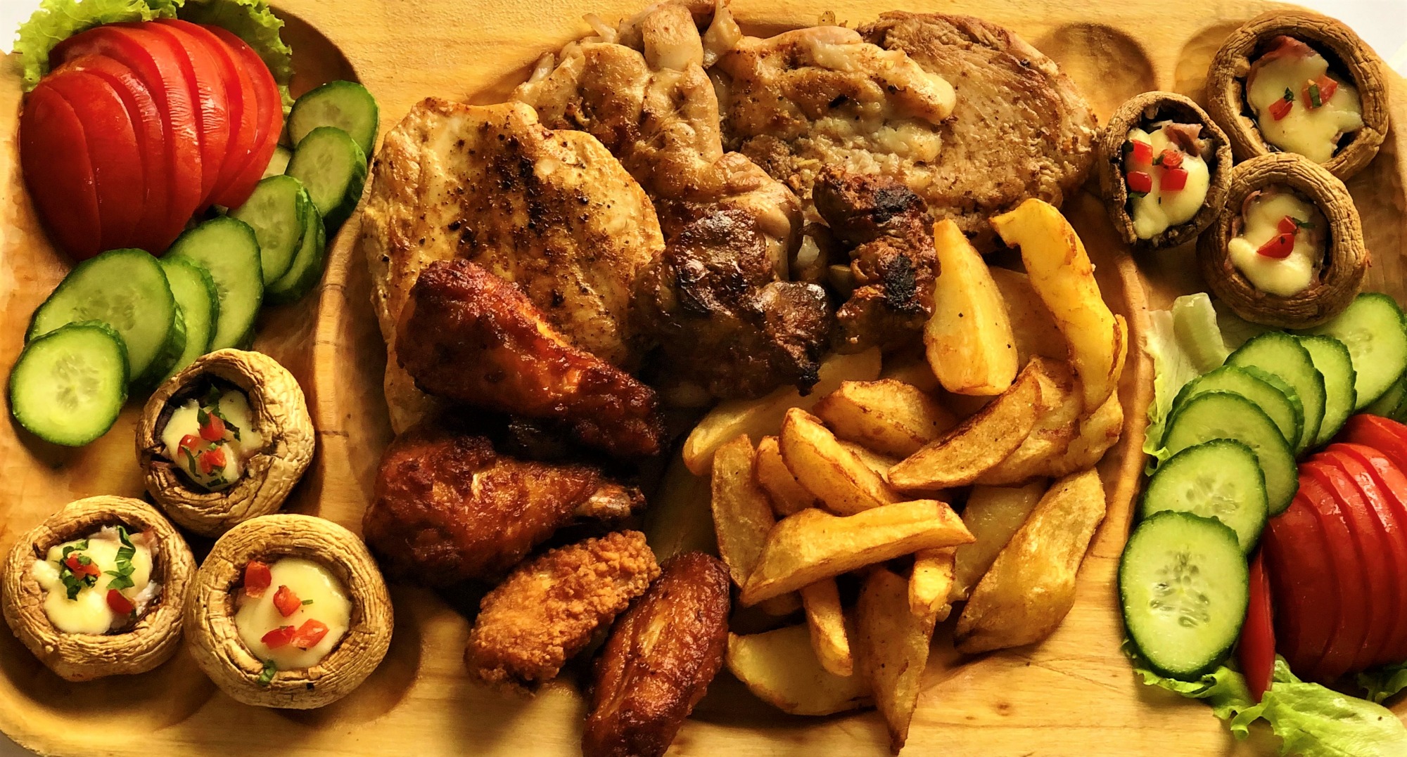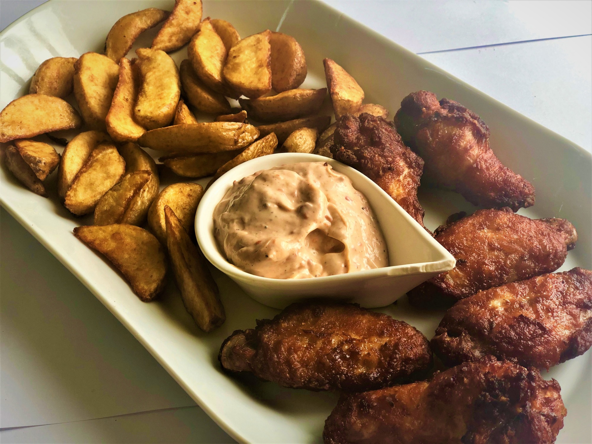 600g - aripioare picante, gujoane picante, sos de maioneza cu usturoi, sos piri